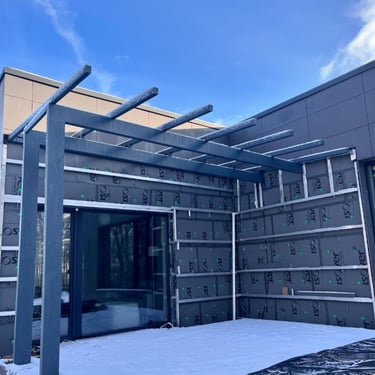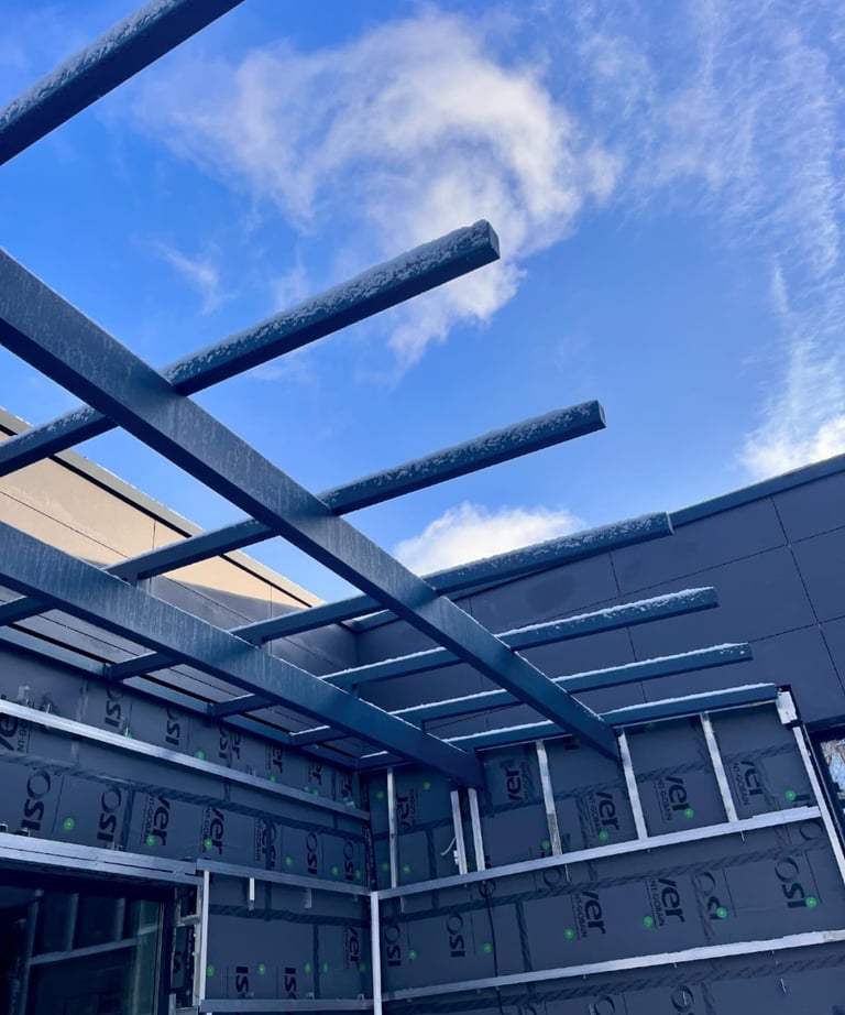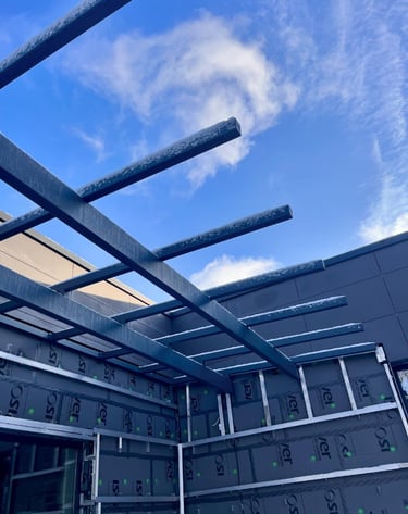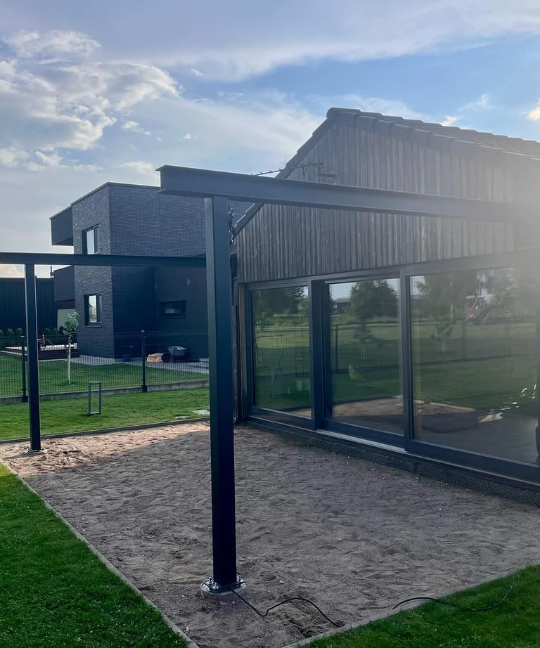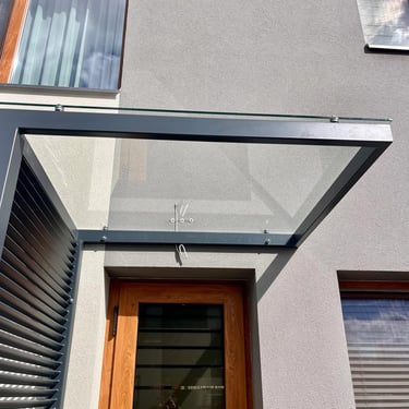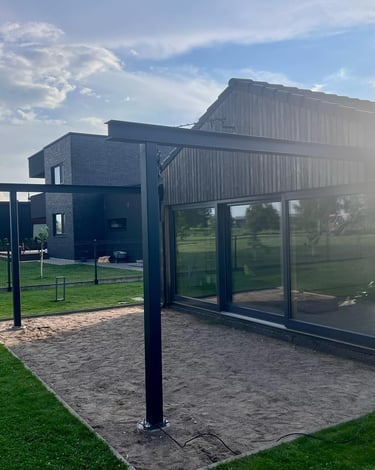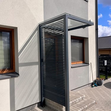 Stoginės ir stogeliai, gaminami su stiklu ar polikarbonatu.